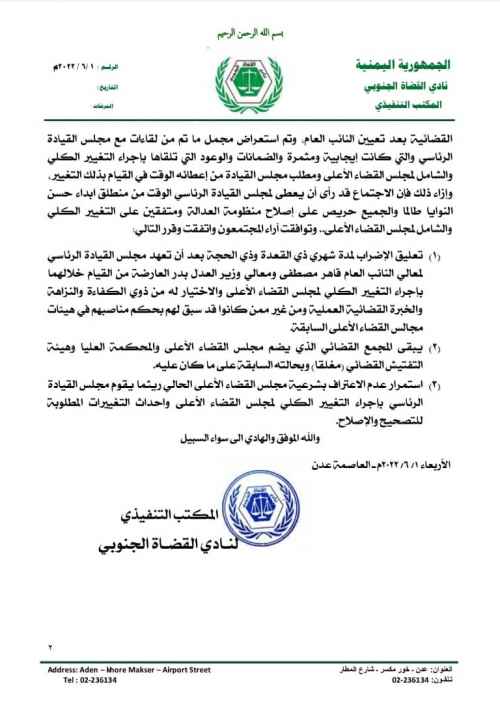 (1) تعليق الإضراب لمدة شهري ذي القعدة وذي الحجة بعد أن تعهد مجلس القيادة الرئاسي لمعالي النائب العام قاهر مصطفى ومعالي وزير العدل بدر العارضة من القيام خلالهما بإجراء التغيير الكلي لمجلس القضاء الأعلى والاختيار له من ذوي الكفاءة والنزاهة والخبرة القضائية العملية ومن غير ممن كانوا قد سبق لهم بحكم مناصبهم في هيئات مجالس القضاء الأعلى السابقة.