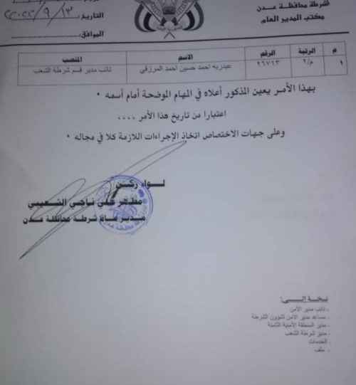 وجاء في القرار بتعيين عبدربه أحمد حسين الجبواني - نائباً لقسم شرطة الشعب بمديرية البريقة.
