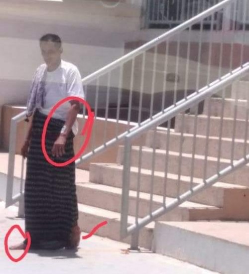 وتظهر الصورة اثار الاعتداء والتعذيب الذي تعرض لها العقيد احمد مسلم احد ابناء المحافظة لدى خروجه لتلقي العلاج في مستشفى خليفة بعد تدهور حالته الصحية اثر تعذيبه على يد عناصر شمالية تتبع الاخوان المسلمين تشرف على سجون سرية وتم انشاءها بتوجيه مباشر من علي محسن الاحمر، بغرض استخدامه لعمليات الاختطافات والاخفاء القسري للنشطاء والمعارضين لسياسة الاخوان المسلمين التي ينفذها محافظ المحافظة.