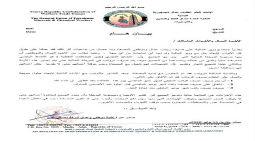 دعت نقابة عمال وموظفي شركة مصافي عدن، كافة العمال والموظفين برفع الاضراب والعودة للعمل، والقبول بالحلول التي تم التوافق عليها مع ادارة الشركة والادارة الذاتية.