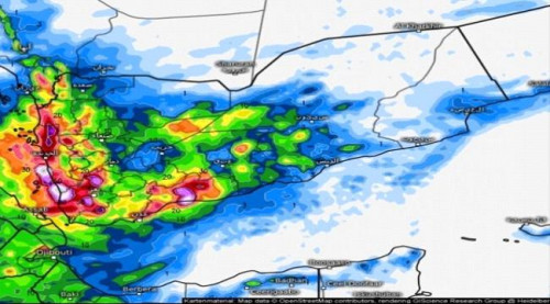 حيث من المتوقع بعد ظهر اليوم وخلال فترة الليل عوده تشكل الخلايا الرعدية الماطرة بغزارة  على مناطق واسعة من  حضرموت ، شبوة ، أبين ، عدن ، مأرب ، الجوف ، لحج ، البيضاء، الضالع ،تعز وعلى معظم المرتفعات الغربية والهضاب الداخلية وبشكل خفيف ومتفرق على بعض مناطق المهرة .