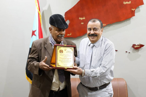 تسلّم اللواء الركن أحمد سعيد بن بريك، القائم بأعمال رئيس المجلس الانتقالي الجنوبي، رئيس الجمعية الوطنية، في مقر الجمعية، شهادة تقدير ودرعاً تذكارياً، مُقدم من قطاع إذاعة عدن الحكومية ممثلة برئيسها الأستاذ عماد شمسان حسن.