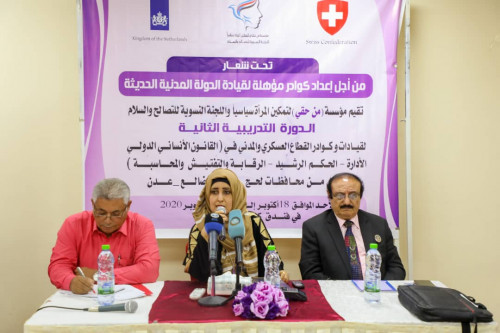دشنت مؤسسة من حقي لتمكين المرأة سياسيا، واللجنة النسوية للتصالح والسلام اليوم الأحد في العاصمة عدن، الدورة التدريبية الثانية في "القانون الدولي الانساني - الادارة - الحكم الرشيد - الرقابة والتفتيش والمحاسبة"، لقيادات وكوادر القطاع العسكري والمدني في محافظات أبين، الضالع، لحج، والعاصمة عدن، وبمشاركة كوادر من الأمانة العامة لهيئة رئاسة المجلس والجمعية الوطنية.