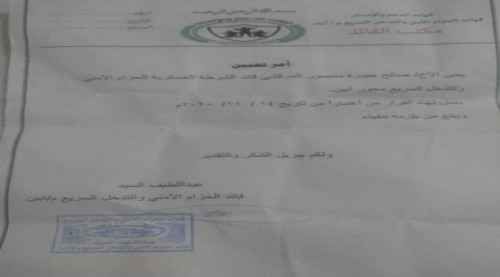 يعيين / المقدم صالح حيدره المرقشي قائدا للشرطه العسكرية للحزام الأمني والتدخل السريع محور أبين، ويلغى أي تكليف او تعيين سابق، ويعمل بهذا من تاريخ صدوره ويبلغ الامر لمن يلزم تنفيذه. وياتي ذلك في اطار الاجراءات العسكرية التي تتخذها قيادة الحزام الأمني والتدخل السريع م/ أبين.