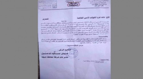 وفي الوثيقة وجه مدير أمن شبوة عوض مسعود الدحبول ، قائد ميليشيا القوات الخاصة بالمحافظة، إلى احالة الجندي المعتقل في نخبة شبوة محمد الصوة الخليفي، إلى البحث الجنائي لاستكمال إجراءاته، أو إطلاق سراحه إذا لم تكن عليه قضية.