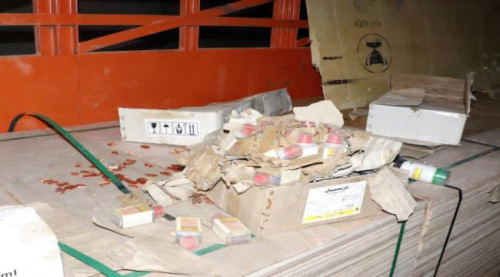 والمواد المهربة المضبوطة في المستودعات سجائر، ومبيدات سامة، وأدوية، ومواد بناء، ومادة الحوت (شمة خارجي)، ومفرقعات نارية، وجميعها لا تخضع لرسوم الضرائب او معاينة اللجان الطبية او هيئة المواصفات والمقاييس.