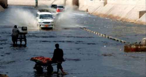 باعة جائلون يدفعون عربات محملة بالفواكه على طول شارع غمرته المياه بعد هطول الأمطار في صنعاء (إ.ب.أ)