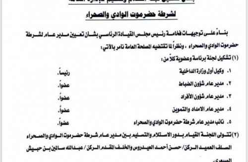 بناء على توجيهات فخامة رئيس مجلس القيادة الرئاسي بشان تعيين مدير عام لشرطة حضرموت الوادي والصحراء ونظرا لما تقتضيه المصلحة العامة نأمر بالآتي: