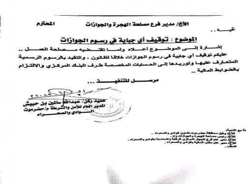 أصدر مدير أمن وادي وصحراء حضرموت العميد ركن عبدالله سالمين بن حبيش قراراً بتوقيف اي جباية في رسوم الجوازات.
