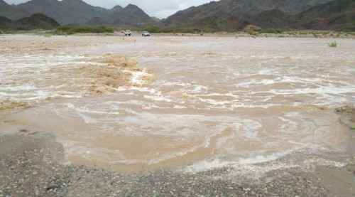تدفقت مياه غزيرة للسيول صباح اليوم الجمعة، في منطقة العبر بمديرية بروم ميفع بالخط الدولي الرابط بين المكلا والعاصمة عدن.