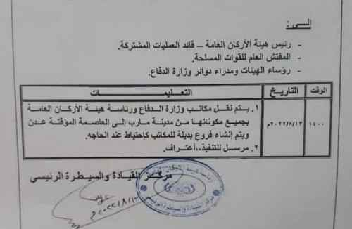 وتضمنت التوجيهات نقل مكاتب وزارة الدفاع ورئاسة هيئة الأركان العامة بجميع مكوناتها من مأرب إلى العاصمة عدن وإنشاء فروع بديلة للمكاتب كاحتياط عند الحاجة.