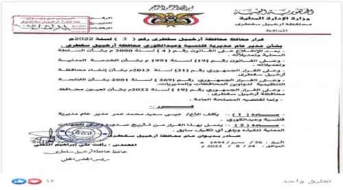 أصدر محافظ محافظة أرخبيل سقطرى المهندس رأفت الثقلي، قراري تعيين مديراً عاماً لمديرية قلنسية وعبدالكوري في المحافظة.