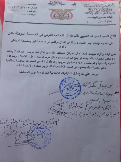 ويطالب قيادت ومشائح ال حميقان حسب الوثائق بضم قواتهم لمحور يافع ويفوضون العميد عبدالعزيز المنصوري باستلام أي دعم لجبهات البيضاء".