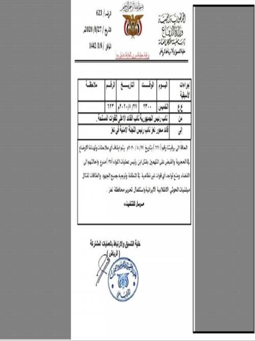 وجاءت هذه البرقية، عطفاً على برقية سابقة بتاريخ 27/ 8/ 2020م وهو نفس التاريخ الذي شنت فيه مليشيا الإخوان حملة انتهاكات واقتحامات طالت منازل عديد من ضباط وقيادة اللواء 35 مدرع بمن فيهم منزل العميد عدنان الحمادي.