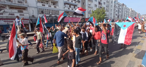 ورفع المشاركون في التظاهرة اعلام دولة الجنوب ولافتات كتب عليها عبارات مطالبة بتوفير الخدمات الأساسية في عدن .