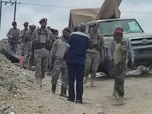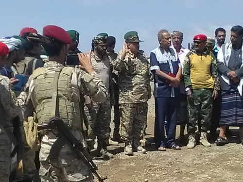 وكان في استقبال اللواء صالح لدى وصولة مقر قيادة محور يافع العميد طيار عبدالعزيز المنصوري قائد المحور والعميد هدار الشوحطي قائد اللواء الرابع دعم واسناد وعدد من القيادات العسكرية المرابطة في جبهة يافع .