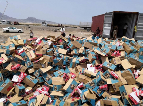 اتلفت هيئة المواصفات والمقاييس بالشراكة مع شرطة وجمارك المنطقة الحرة اليوم السبت عبر مكاتبها بميناء الحاويات بالعاصمة عدن حاوية تحتوي على كمية عدد 2,086 كرتون كيك ماركة Like متعددة بلد المنشأ تركيا