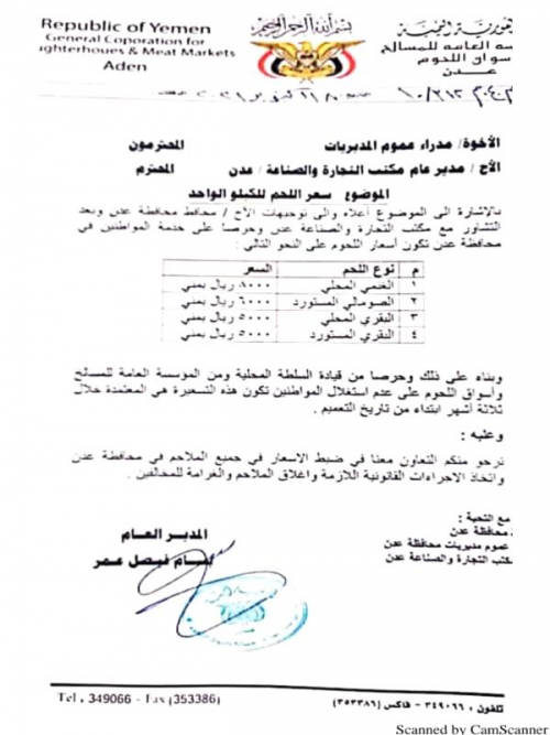 أقرت المؤسسة العامة للمسالخ وأسواق اللحوم تسعيرات ثابتة لانواع اللحوم في مختلف ملاحم العاصمة عدن ولمدة ثلاثة أشهر وعلى النحو الآتي: