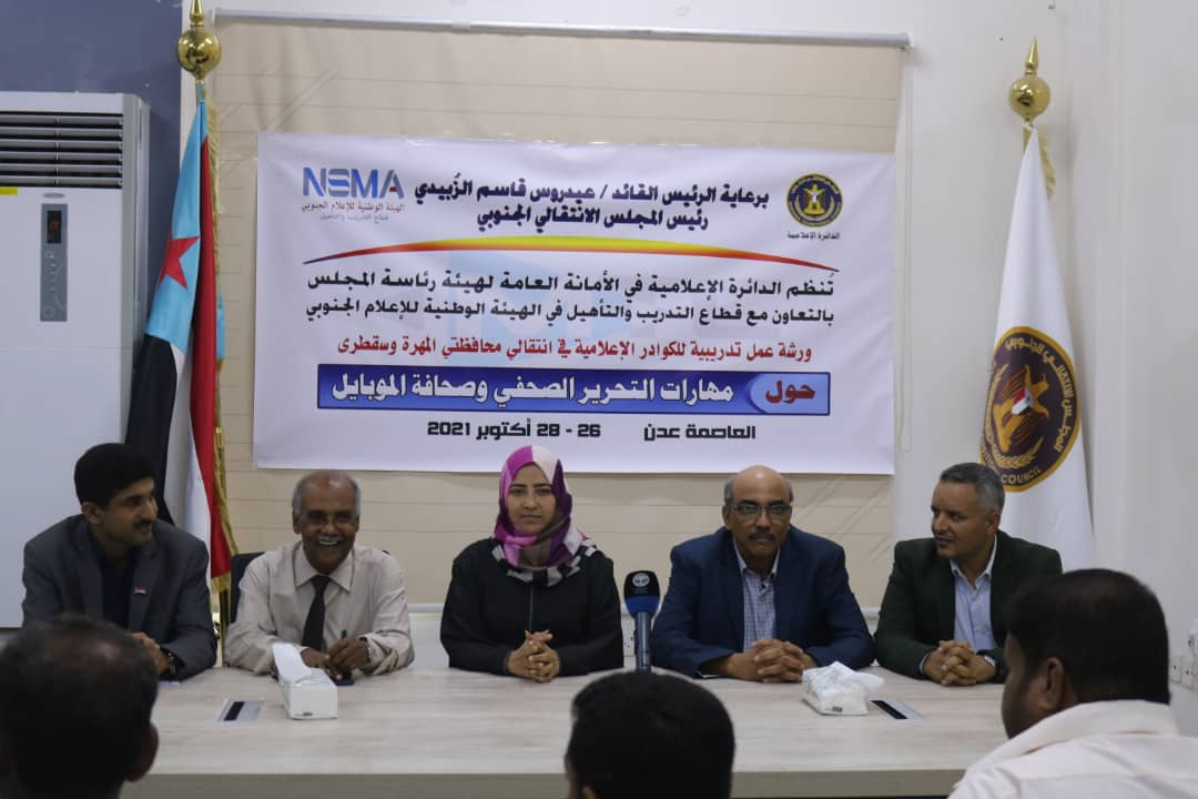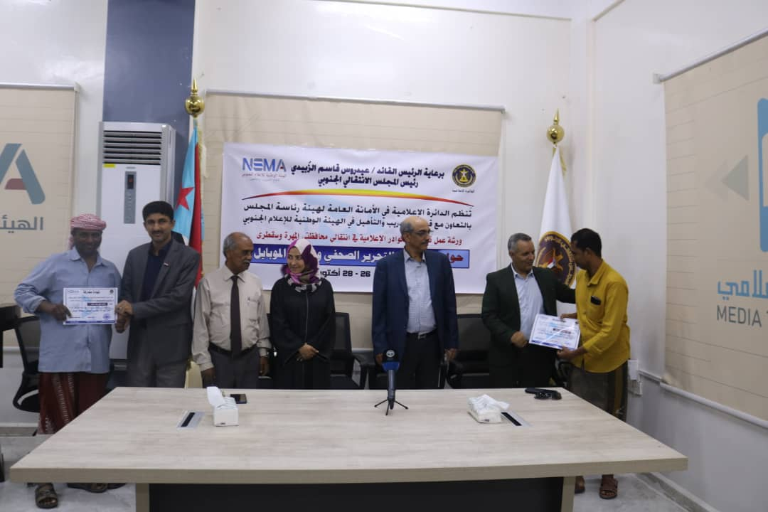 اختتمت الدائرة الإعلامية بالأمانة العامة لهيئة رئاسة المجلس الانتقالي الجنوبي اليوم الخميس، في العاصمة عدن، ورشة العمل التدريبية التي نظمتها بالتنسيق مع قطاع التدريب والتأهيل بالهيئة الوطنية للإعلام الجنوبي، لتعزيز مهارات منتسبي الإدارات الإعلامية في محافظتي المهرة وسقطرى في التحرير الصحفي وصحافة الموبايل، برعاية الرئيس القائد عيدروس الزُبيدي رئيس المجلس الانتقالي الجنوبي.