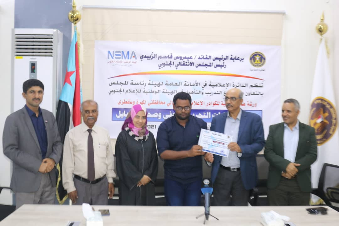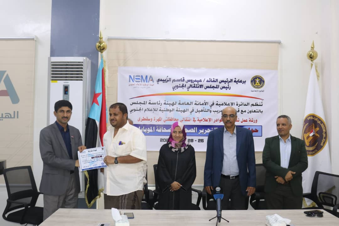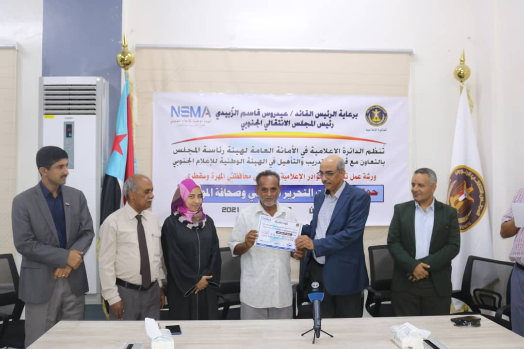 الدائرة الإعلامية وقطاع التدريب والتأهيل يختتمان ورشة العمل التدريبية لمنتسبي الإدارات الإعلامية في المهرة وسقطرى
