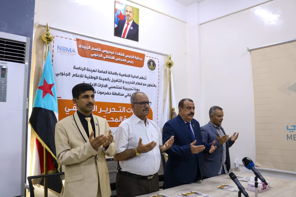 دشَّن اللواء أحمد سعيد بن بريك، القائم بأعمال رئيس المجلس الانتقالي الجنوبي، رئيس الجمعية الوطنية، ومعه الأستاذ فضل محمد الجعدي نائب الأمين العام للأمانة العامة لهيئة رئاسة المجلس، اليوم الثلاثاء، في العاصمة عدن، الدورة التدريبية التي نظمتها الدائرة الإعلامية بالأمانة لهيئة رئاسة المجلس الانتقالي، بالتعاون مع قطاع التدريب والتأهيل بالهيئة الوطنية للإعلام الجنوبي، في "مهارات التحرير الصحفي وصناعة المحتوى الرقمي" لمنتسبي الإدارات الإعلامية في الهيئات التنفيذية للقيادات المحلية للمجلس بمحافظة حضرموت.