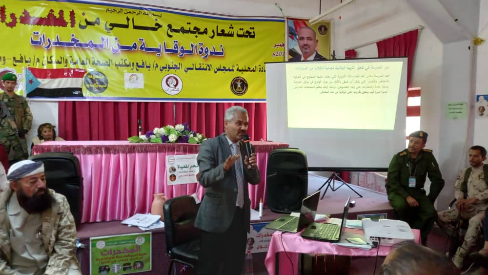 نظمت الادارة القانونية بالهيئة التنفيذية للقيادة المحلية للمجلس الانتقالي الجنوبي في مديرية لبعوس يافع بمحافظة لحج، اليوم الثلاثاء، ندوة توعوية للوقاية من خطر المخدرات، تحت "شعار مجتمع خالي من المخدرات" بحضور الشيخ عبدالرب النقيب عضو هيئة رئاسة المجلس.
