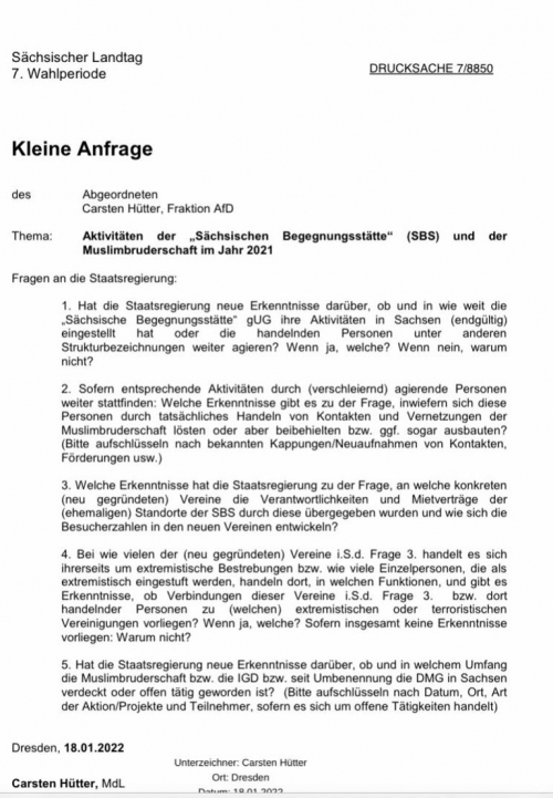 ووجه الاستجواب المكتوب أسئلة صعبة لحكومة الولاية عن أنشطة الإخوان، وعلى وجه الخصوص مركز اجتماعات ساكسونيا، ومناوراته الأخيرة لخداع السلطات الأمنية.