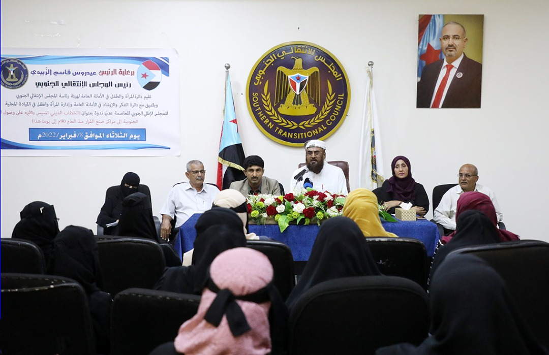 أقامت دائرة المرأة والطفل بالأمانة العامة لهيئة رئاسة المجلس الانتقالي الجنوبي بالتنسيق مع دائرة الفكر والارشاد ،اليوم الثلاثاء، في العاصمة عدن، ندوة بعنوان "الخطاب الديني المسيس وتأثيره على وصول المرأة الجنوبية إلى مركز صنع القرار منذ العام 90 إلى يومنا هذا" برعاية الرئيس القائد عيدروس الزُبيدي، رئيس المجلس الانتقالي الجنوبي.