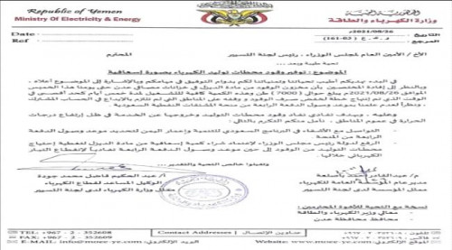 ورفع وكيل وزارة الكهرباء ومدير عام المؤسسة العامة للكهرباء، رسالة رسمية امس الخميس الموافق 26 أغسطس، إلى الأمين العام لمجلس رئاسة الوزراء، رئيس لجنة التسيير لمنحة الوقود جاءت على النحو التالي :