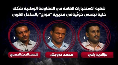 وأوضح أنه تم ضبط ثلاثة من أخطر أفراد الخلية جميعهم من أبناء مديرية موزع بمحافظة تعز هم (شمس الدين محمد مقبل الحميري، ومحمد عوض درويش، وعزالدين عبده علي راعي) بعد ان تم تجنيدهم من قبل قيادي حوثي من أبناء المديرية يدعى (عماد عبد السلام الحميري) ويعمل في مناطق سيطرة المليشيات.