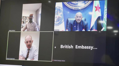 عقد الرئيس القائد عيدروس قاسم الزُبيدي، رئيس المجلس الانتقالي الجنوبي القائد الأعلى للقوات المسلحة الجنوبية، اليوم الاثنين، اجتماعاً مرئياً مع سفير المملكة المتحدة لدى اليمن، سعادة ريتشارد اوبنهايم، ونائبه السيد اشتياق غفور.