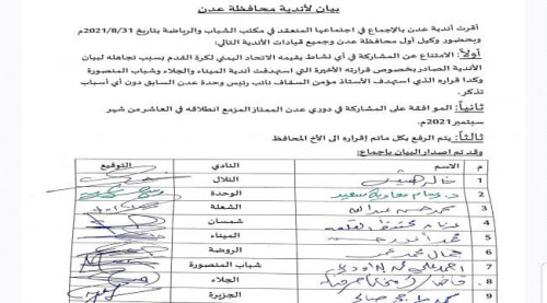 ورد ذلك في البيان الذي صدر صباح عن رؤساء أندية العاصمة عدن برئاسة الأخ/ عرفات محمد علي قاسم مدير مكتب الشباب والرياضة بعدن و بحضور الأخ/ محمد نصر شاذلي وكيل أول محافظة عدن وقيادة أنديتنا العشرة (التلال ,الوحدة ,الشعلة ,شمسان، الميناء ،الروضة ،شباب المنصورة ،الجلاء ،الجزيرة) الذي نص على عدم المشاركة في الدوري اليمني الممتاز لكرة القدم المقرر انطلاقه منتصف شهر سبتمبر ،كما طالب المجتمعون بتسليم نسخة من البيان لمحافظ محافظة عدن .