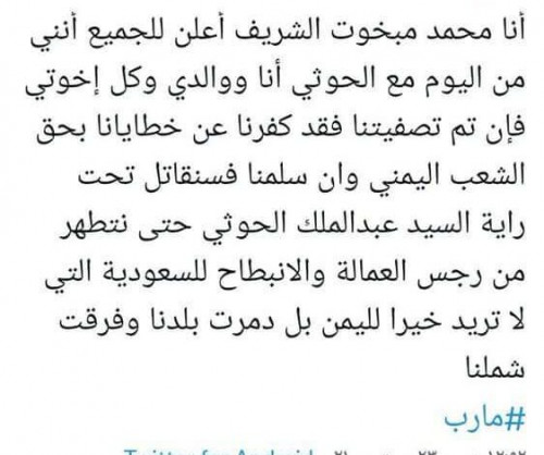 وقال رئيس حزب الإصلاح في مأرب محمد مبخوت الشريف، في تغريدة نشرها على حسابه في“تويتر”: أعلن للجميع انني من اليوم مع الحوثي أنا ووالدي وكل اخوتي فإن تم تصفيتنا فقد كفرنا عن خطايانا بحق الشعب اليمني.