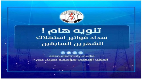 وتدعو كهرباء عدن جميع المواطنين إلى الالتزام بسداد فواتير الاستهلاك الشهري بهدف تمكين المؤسسة من الايفاء بالتزاماتها واستمرارها بتقديم الخدمة بالحد الممكن.