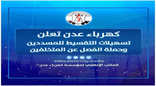 أعلنت المؤسسة العامة لكهرباء عدن عن تقديم كافة التسهيلات للمشتركين في عملية التقسيط للفواتير وذلك نتيجة للظروف المعيشية التي يعاني منها المواطنين.