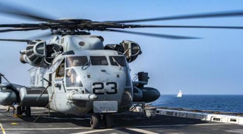 كما عرضت صورًا للمروحية (طراز (CH-53E u تابعة لمشاة البحرية الأمريكية، (المارنيز)، أثناء هبوطها على سطح سفينة النقل البرمائية (يو إس إس بورتلاند)، موضحة أن السفينة الحربية تبحر في باب المندب.