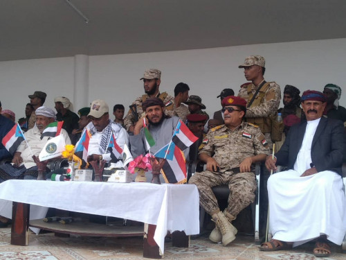 وشهدت الاحتفالية، التي استهلت بآي من الذكر الحكيم، ثم النشيد الوطني الجنوبي، حضور رسميا وجماهيريا كبيرا تقدمه رئيس الهيئة التنفيذية للقيادة المحلية للمجلس الانتقالي بالمحافظة رأفت الثقلي، ونائبه ناظم بن قبلان، والسلطان علي بن عيسى بن عفرار، ومدير عام الشرطة العميد علي الدكسمي وأركان اللواء الأول مشاة بحري العميد محسن الحاج.
