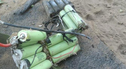 وتظهر صورة لبقايا حطام الطائرة المفخخة الحوثية التي تمكن أبطال القوات المشتركة من إسقاطها وتدميرها.