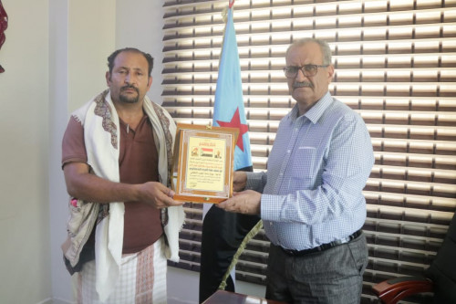تسّلم الأستاذ فضل محمد الجعدي نائب الأمين العام للأمانة العامة لهيئة رئاسة المجلس الانتقالي الجنوبي، اليوم الخميس، درعا تذكاريا باسم هيئة رئاسة المجلس، مقدم من اللجنة المنظمة لدوري الشهيد أبو اليمامة لكرة القدم.