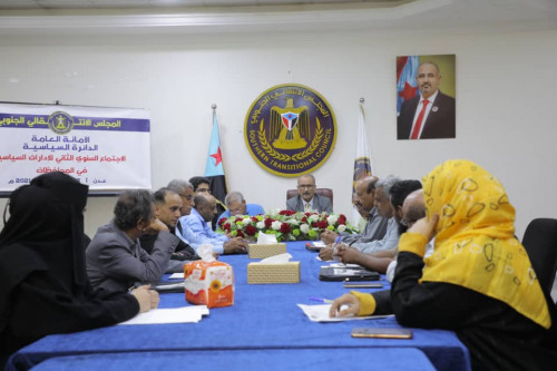عقدت الدائرة السياسية في الأمانة العامة لهيئة رئاسة المجلس الانتقالي الجنوبي، اليوم الإثنين، الاجتماع السنوي الثاني مع الإدارات السياسية في الهيئات التنفيذية للقيادات المحلية للمجلس في المحافظات.
