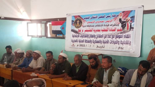 عقدت القيادة المحلية للمجلس الانتقالي الجنوبي بمديرية المسيمير بمحافظة لحج، اليوم السبت لقاءً موسعاً مع المشائخ، والأعيان، والشخصيات الاجتماعية، وقيادات السلطة المحلية، والاجهزة الأمنية والأحزمة وقيادات عسكرية وسياسية بالمديرية، برعاية الرئيس القائد عيدروس قاسم الزبيدي رئيس المجلس الانتقالي الجنوبي، وإشراف رئيس تنفيذية انتقالي المحافظة المحامي رمزي الشعيبي.