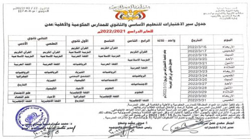 أعلن مكتب التربية والتعليم في العاصمة عدن عن موعد الاختبارات في مدارس التعليم الاساسي والثانوي.