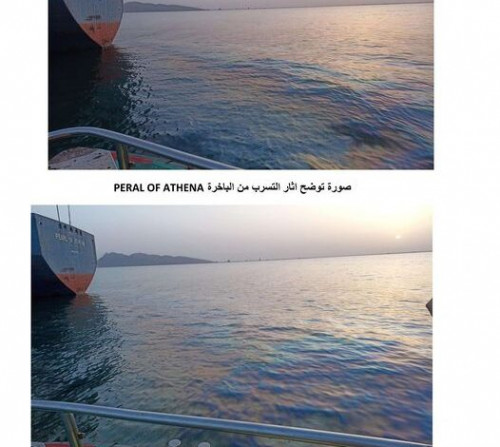 وأكد فريق الهيئة، الذي نزل أمس الجمعة، حقيقة، حول التسرب النفطي. وقال التقرير أن الفريق رصد رائحة نفاذة لمادة البترول، بالإضافة الى تسرب زيتي، من الباخرة أثينا PEARL OF ATHENA. التابعة لشركة عابر البحار المملوكة للتاجر النافذ أحمد العيسي.