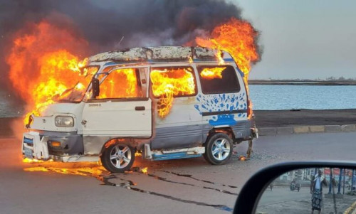 نجا عددا من ركاب مركبة نقل صغيرة (باص دباب) اليوم بأعجوبة بعد اشتعال النيران فيه في خط الجسر بالعاصمة عدن.