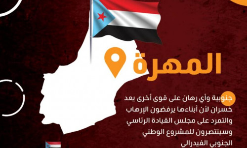 وأشاروا إلى أن المهرة جنوبية وأي رهان على قوى أخرى يعد خسران لأن أبناءها يرفضون الإرهاب والتمرد على مجلس القيادة الرئاسي وسينتصرون للمشروع الوطني الجنوبي الفيدرالي.