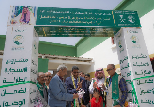 سلم مركز الملك سلمان للإغاثة والأعمال الانسانية وزارة التربية والتعليم والسلطة المحلية بمحافظة لحج 6 مدارس بعد استكمال الأعمال الإنشائية وإعادة التأهيل فيها ضمن مشروع الاستجابة الطارئة لضمان الوصول إلى بيئة تعليمية آمنة الممول من المركز وتنفذه منظمة ديفرستي بالتنسيق مع وزارة التربية والتعليم.