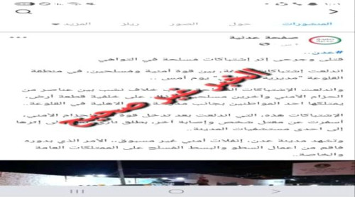 تناقلت بعض الصفحات المعروفة في مواقع التواصل الاجتماعي خبراً حول وقوع اشتباكات مسلحة في مديرية التواهي منطقة القلوعة ونود التوضيح أن الحادثة وقعت قبل ثلاثة أيام وليست كما تم تداوله اليوم.