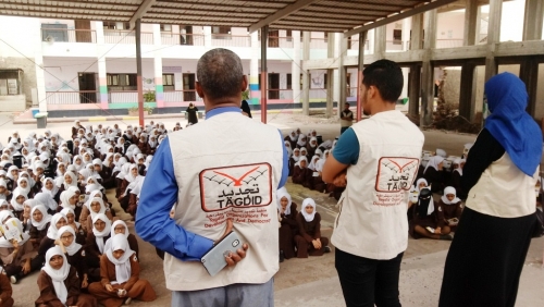 دشنت منظمة "تجديد" للتنمية والديمقراطية صباح اليوم النزول الميداني إلى مدارس وثانويات مديرية صيرة، في إطار حملة التوعية بمخاطر المخدرات، التي ترعاها وزارة الشباب والرياضة، في محافظة عدن.