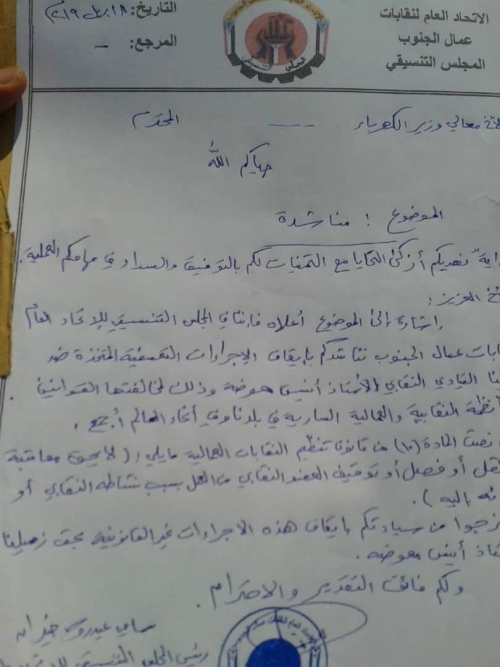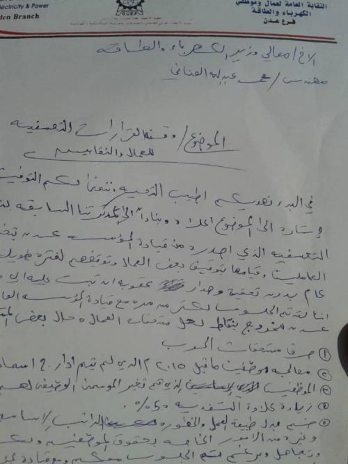 وتم تسليم مذكرة مطالب إلى الاخ الوزير المهندس/ محمد العناني من قبل رئيس نقابة كهرباء عدن الأخ/ صلاح تواهي وجاء اهم مافيها وقف القرارت التعسفية الذي أصدرت بحق النقابين وحقوق العمال ومستحقاتهم.