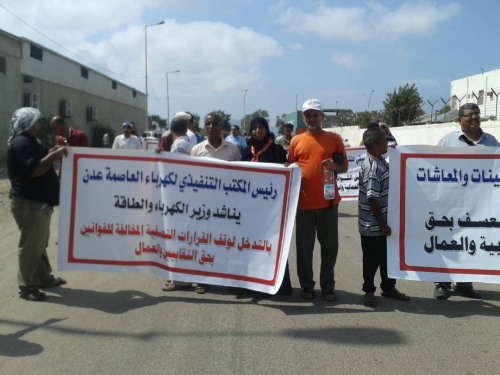 أقيمت صباح اليوم وقفة إحتجاجية أمام مبنى ديوان عام وزارة الكهرباء والطاقة إحتجاجا على القرارت التعسفية الذي صدرت بحق عمال نقابة الكهرباء من قبل مدير مؤسسة كهرباء عدن ويعد هذا مخالفا لقانون النقابات وتعدي صارخ للكوادر الجنوبية وأكد رئيس المجلس التنسيقي للاتحاد العام لنقابات عمال الجنوب الاخ/سامي خيران ان اي تعدي لاي نقابي جنوبي في أي مرفق في الدولة يعتبر بحد ذاته تعدي على جميع النقابات الذي تمثل جسد واحد لمؤسسات الجنوب الحبيب الذي تم تحريره وضحينامن أجله بأغلى مانملك .